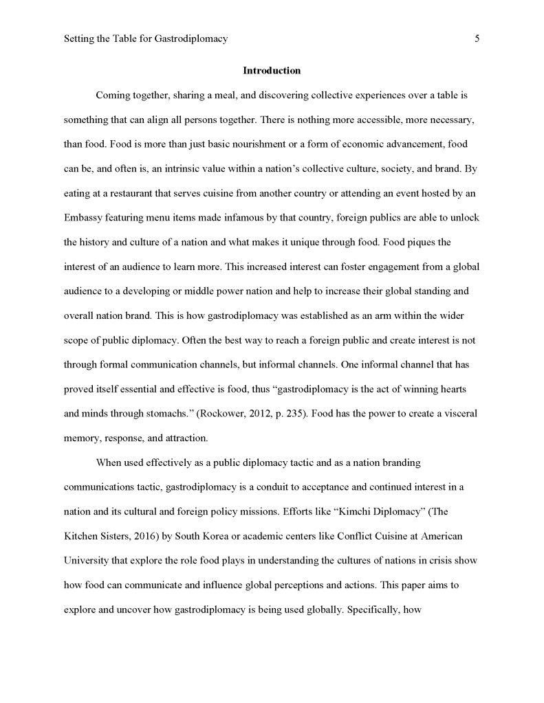 My research detailed the burgeoning field of gastrodiplomacy – which is the ability for a nation to communicate and establish its own narrative to a global audience by utilizing its cuisine and cultural heritage as an attractive and tangible component of its identity. To successfully utilize gastrodiplomacy, a country must have a rich cultural history connected to the development and utilization of its local food as well as the ability for its government to engage with various stakeholders (non-profits, corporations, private individuals, etc.).